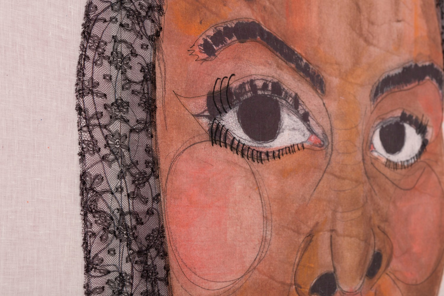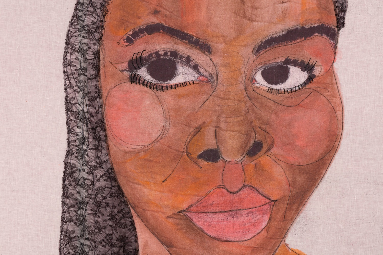 Dye print on Linen with applique and acrylic, silk charmeuse lining, aluminum stretcher